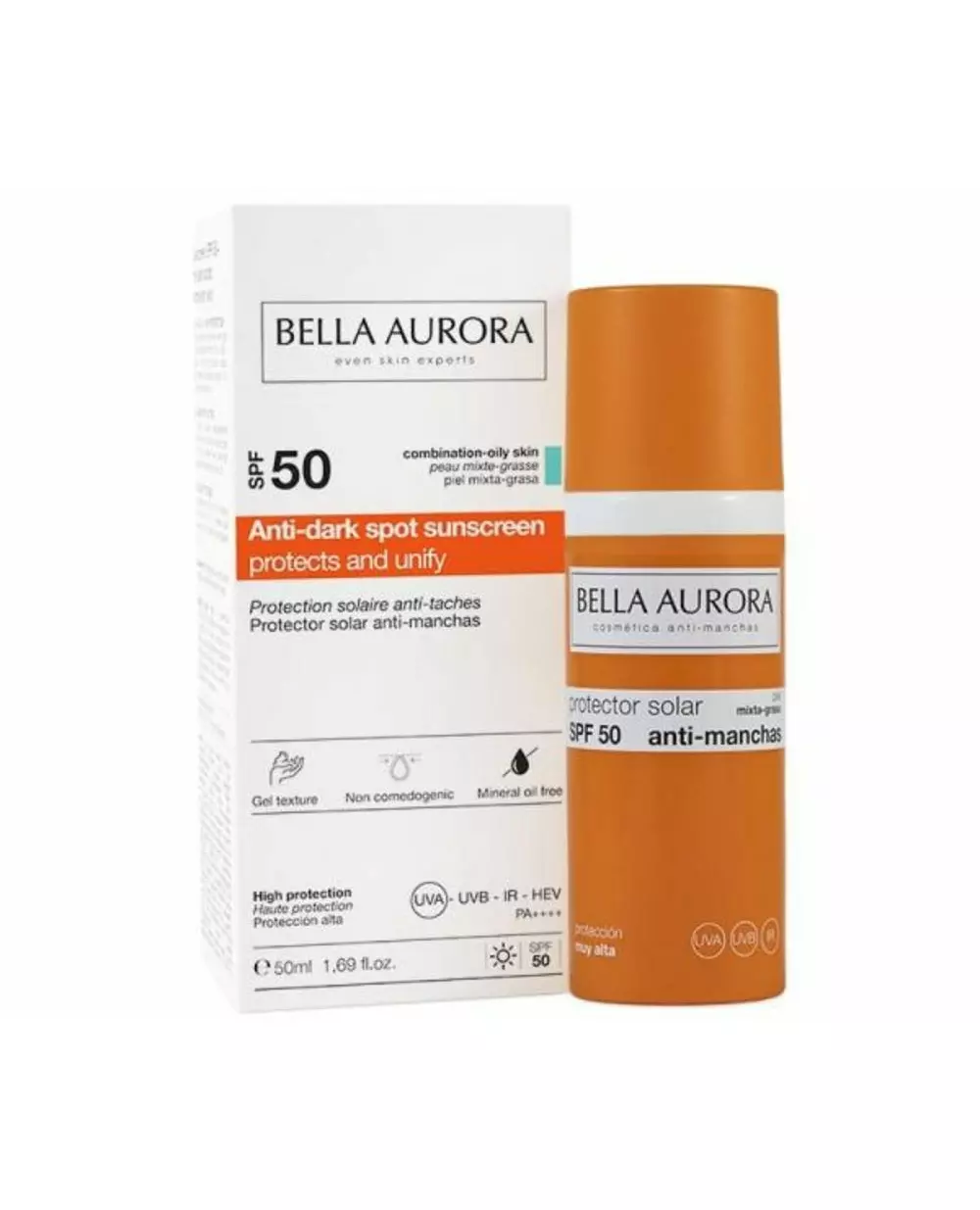 Bella Aurora Anti-Dark Spots gel-lignende beskyttende ansiktskrem med solkrem for kombinert/fettet hud, SPF50+, 50 ml