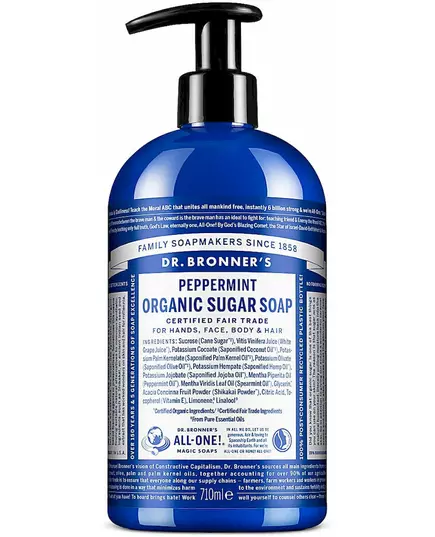Nyt den revitaliserende Dr. Bronner's Organic Sugar Soap Peppermint 710 ml.