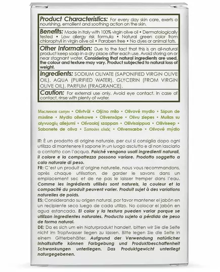 Sodium Olivate (saponified virgin olive oil)● Water (Acqua)● Glycerin (from virgin olive oil)● Fragrance (Parfum).