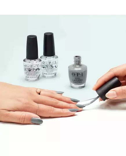 Begynn med å påføre OPI Base Coat på rene, tørre negler med neglebåndene skjøvet tilbake.
